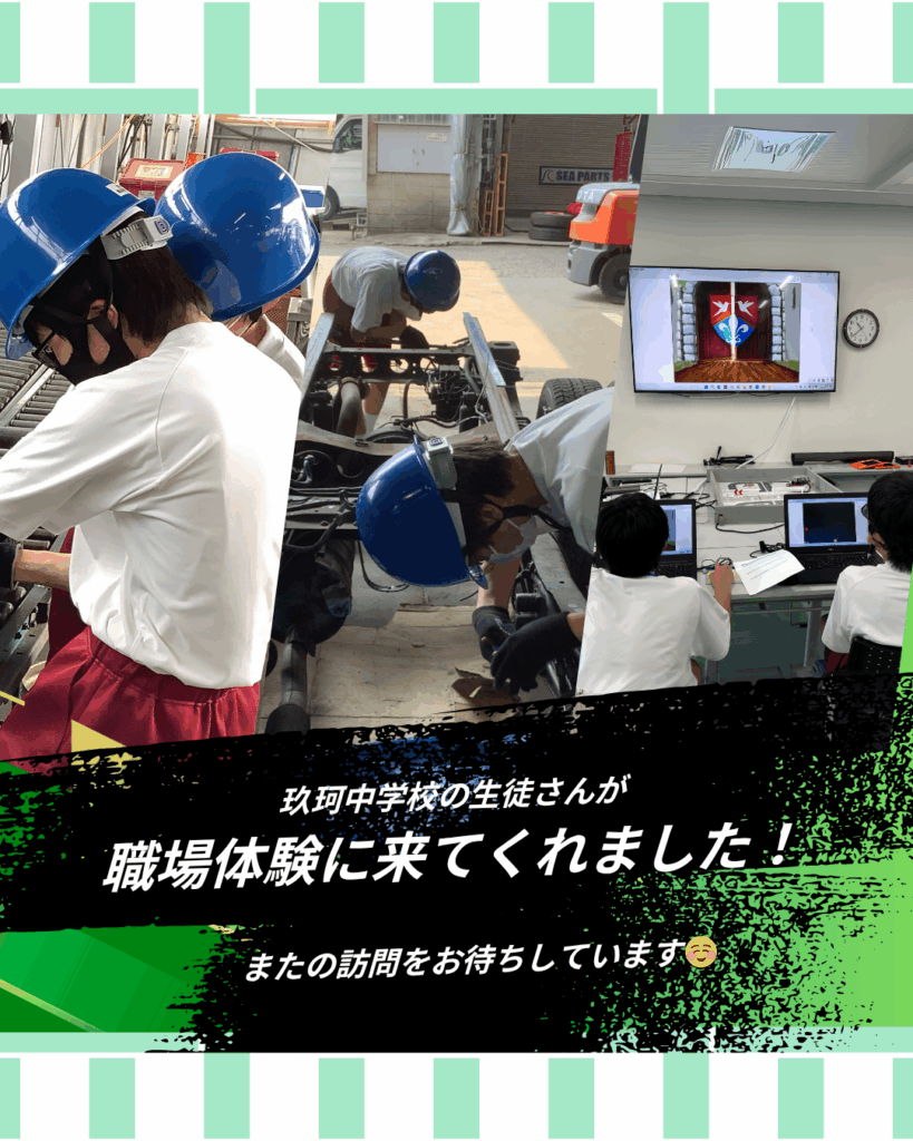 7月2日・3日の2日間、玖珂中学校の2年生の2名の生徒さんがが職場体験に来てくれました! 1日目は当社の会社説明の後、自動車の情報をパソコンへ入力する作業や工場で自動車部品の取り外し作業をしてもらいました。そして2日目にはプログラミング体験やタイヤ、ホイール自動離脱ロボットの操作に挑戦。 暑い中、一生懸命取り組む姿が印象的でした。短期間でしたが、生徒さんたちが何か新しい気づきや学びを持ち帰ってくれたら嬉しいです。